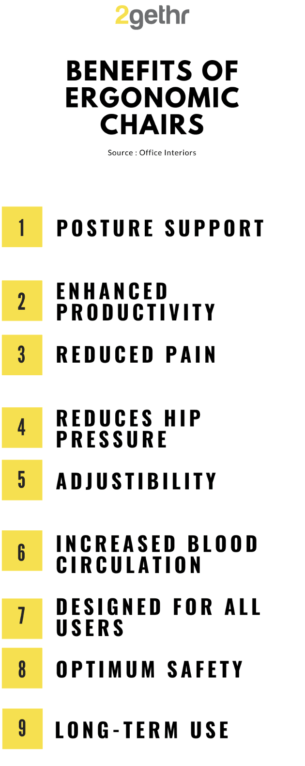 Having a comfortable chair to sit on might be one of the best feelings ever! Ergonomic seating ensures support for your back, neck & more than adequate cushioning for your butt, amongst other benefits. It works for everybody due to the adjustability feature, making it a good long-term solution to have in coworking spaces. These spaces tend to pride themselves on ergonomic seating, with multiple options for seating as well, ERGO (get it?!) making them a good option for hybrid styles of work. Say goodbye to your back pain - at least while you work!